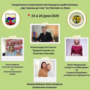 Национална психолошко-мотивациска работилница „Од тишина до глас“ во Пехчево со Леон 📍 23 и 24 Јуни 2025 Со длабока благодарност и соработка, со задоволство го најавуваме следниот чекор од нашата Национална психолошко-мотивациска турнеја „Од тишина до глас“, организирана од Градоначалникот на Општина Пехчево и Здружението за личен развој, едукација и психолошка помош и поддршка „Гласот од тишината“ – Скопје, под раководство на Амела Мемиш Апостоловска, Клинички психолог, основач и претседател на здружението, и Жанет Маркушова дипломатски член и сопруга на амбасадорот на Република Словачка во Скопје. 📌 23 Јуни 2025 Во заедничка организација со: Градоначалникот Александар Китански, Директорката на детската градинка „7ми Септември“ – Гордана Вазлиска, Директорката на ООУ „Ванчо Китанов“ – Добрила Јовеска, ќе се одржи психолошко-мотивациска работилница за децата со попреченост, нивните родители и стручниот кадар кој секојдневно се грижи за најмалите. Оваа средба е посветена на: храбрите деца, семејствата што чекорат по својот пат со многу љубов и борба, и стручниот кадар кој со срце и посветеност ги следи нивните чекори. 📌 24 Јуни 2025 Во Домот на културата „Јане Сандански“, под водство на Елица Јовевска – Советник за планирање на ЛЕР, ќе се одржи јавна трибина на тема: инклузија, родителство и психолошка поддршка. 🕰️ 24.06.2025 година (вторник), 17:00 часот – Дом на културата „Јане Сандански“ – Пехчево ✨ За секој родител кој ќе присуствува, подготвивме и мало, но значајно изненадување како симбол на благодарност, признание и почит за вашата љубов, истрајност и посветеност.